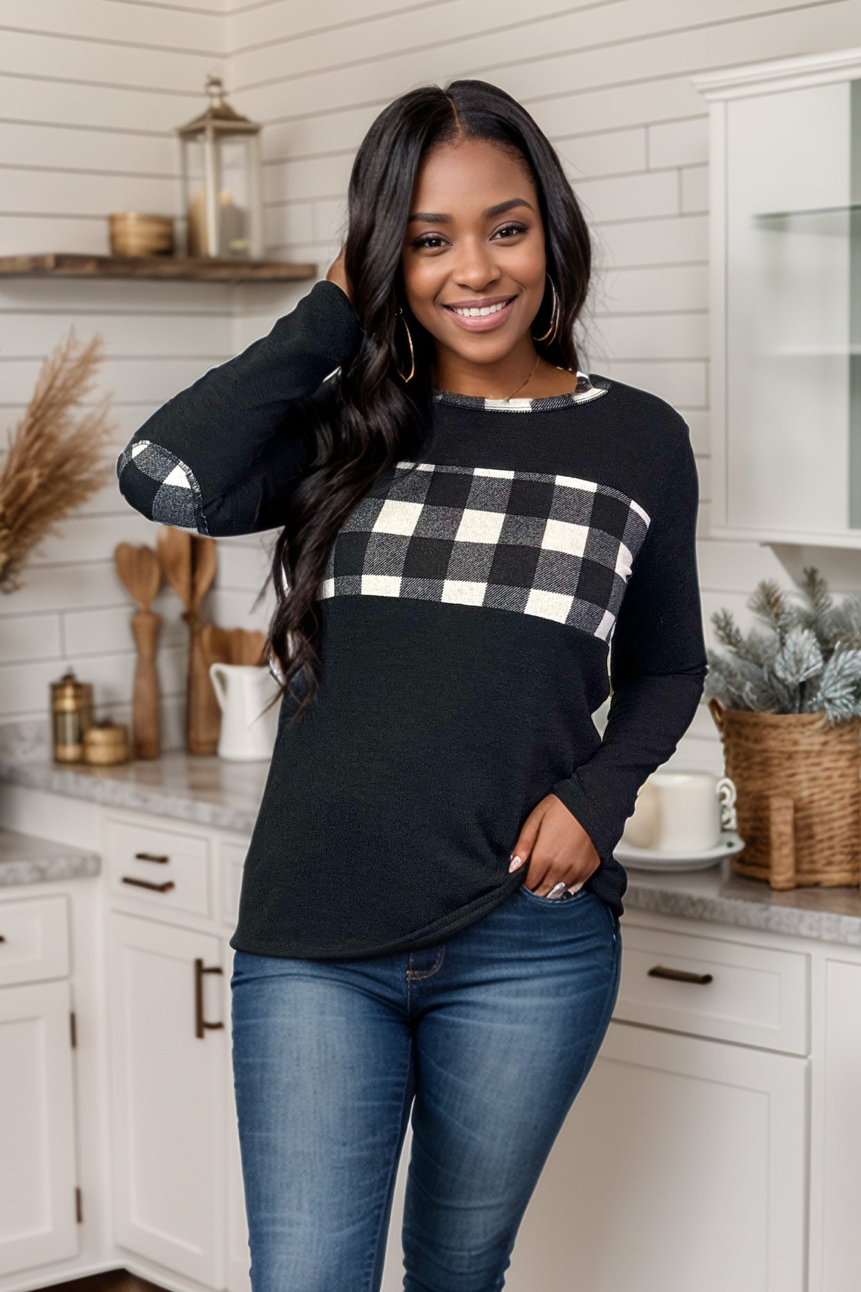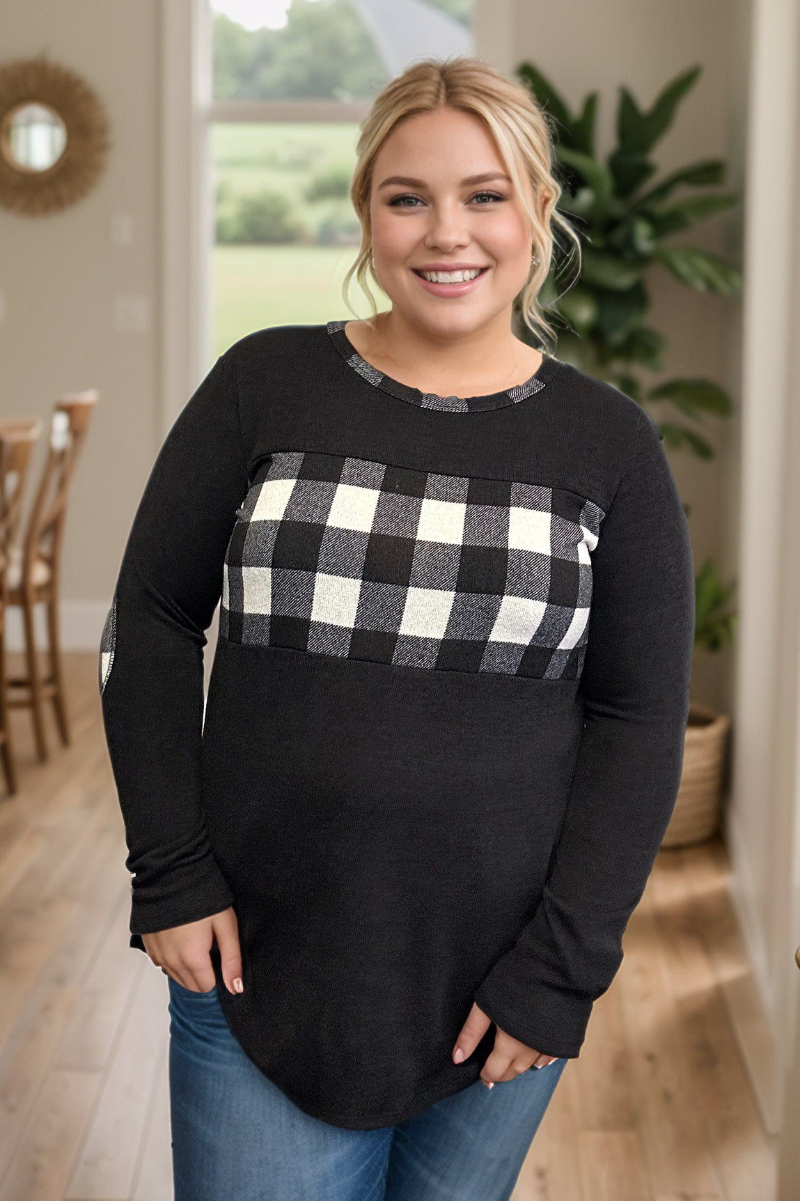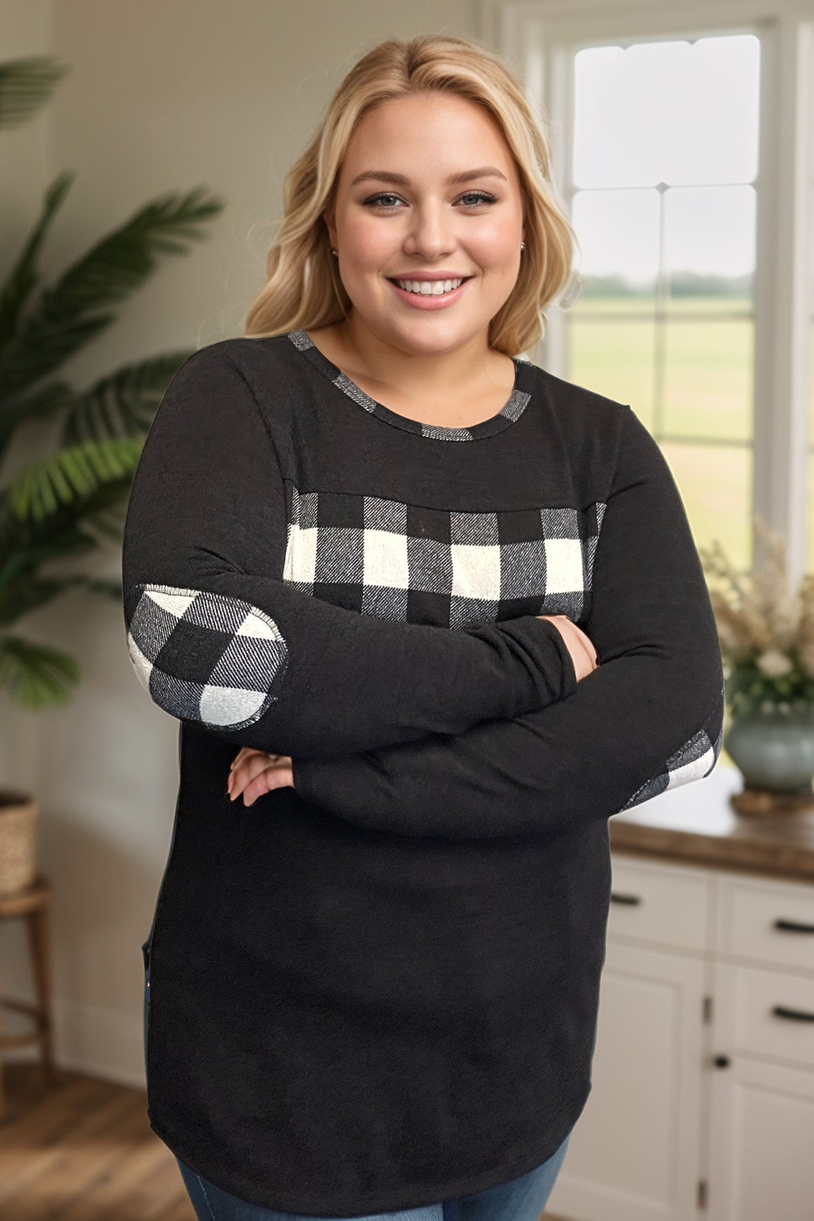 Get ready to conquer the fashion game with the Checkmate Pullover! Made from a cozy hacci sweater knit, this pullover features a round neckline, stylish plaid and black colorblock design, and playful elbow patches. Plus, the plaid trim on the neckline adds a playful touch. Checkmate your fashion opponents today!