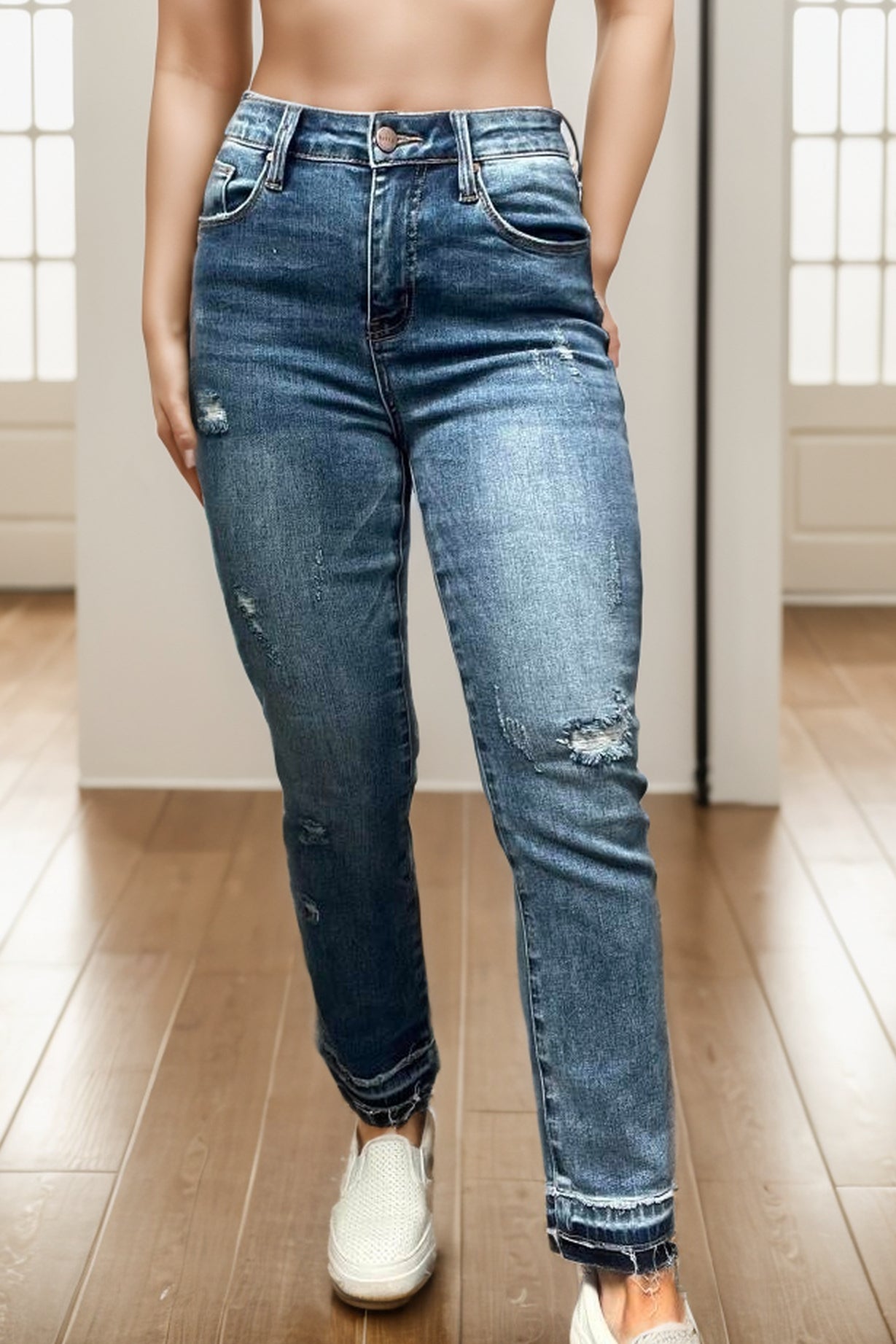 Get ready to step up your style game with our Risen Crops! These cropped jeans feature a flattering mid-rise fit and just the right amount of stretch for all-day comfort. With a trendy medium wash and subtle distressing, these jeans will take your outfits to the next level.