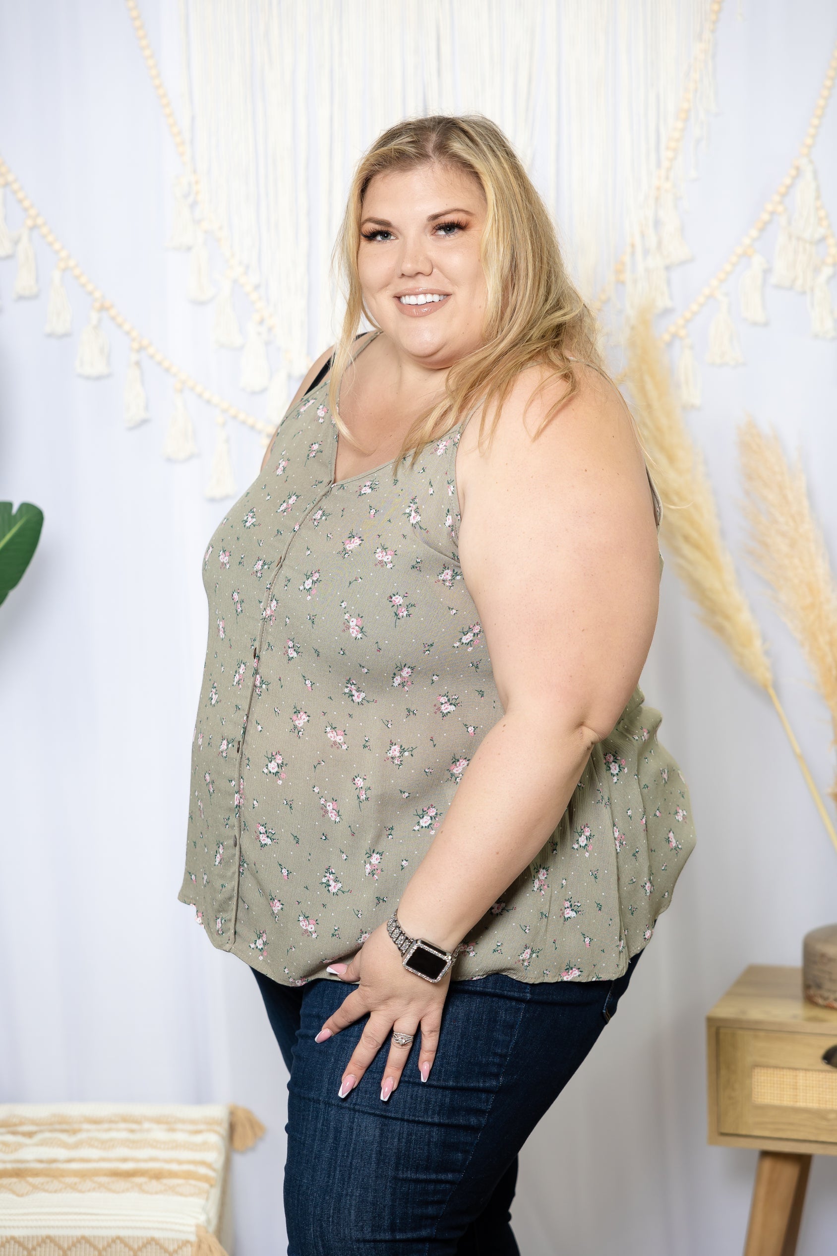 Introducing the Serene Grace Tank. Featuring a luxe woven fabric and classic v-neck cut, this tank is designed with spaghetti straps and subtle button-down detailing to provide a tailored look. Perfect for the office or weekend wear, the Serene Grace Tank offers a timeless and sophisticated look.