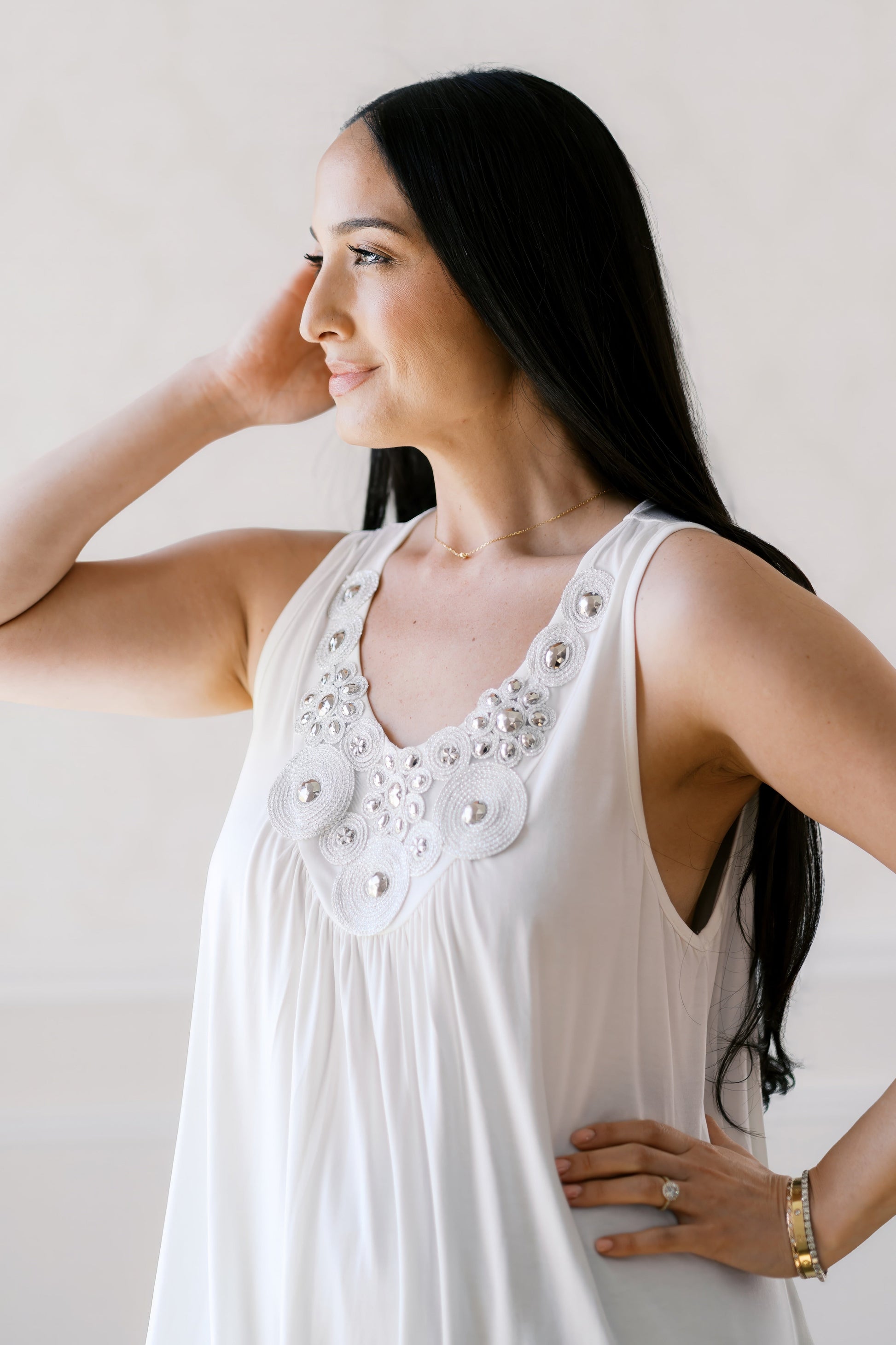 Sparkle and shine in our Starlit Sparkle Tank! The LUREX beaded neck trim adds an extra touch of elegance, while the solid jersey tank top ensures a comfortable fit. Perfect for any occasion, this tank is sure to make a statement with its unique and playful design!