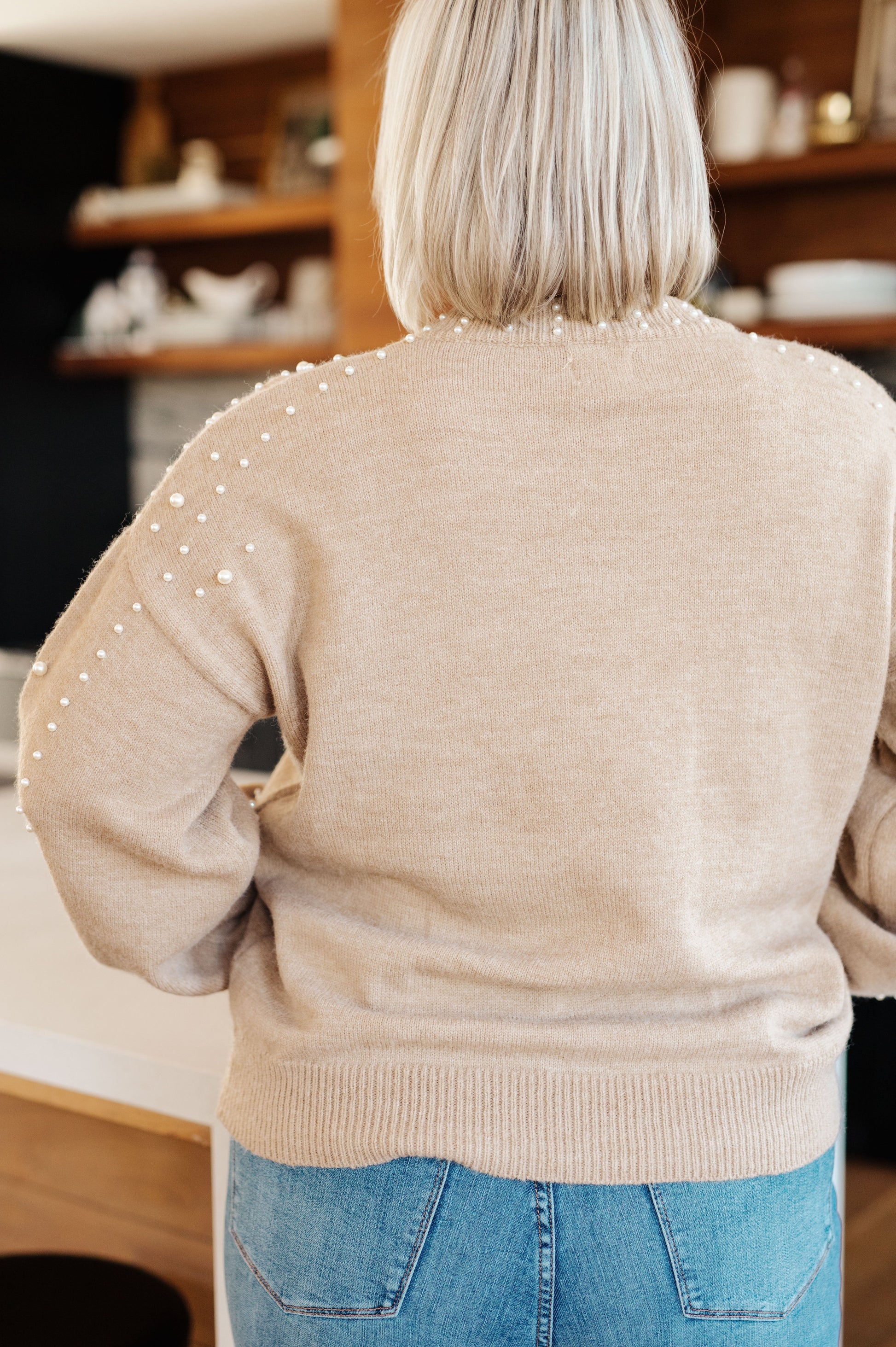 Stay stylish and cozy with our String Me Along Pearl Accent Sweater. Made from lightweight knit, this sweater features faux pearl accents, a ribbed crew neckline, dropped shoulders, and puff sleeves. Perfect for adding a touch of elegance to any outfit.