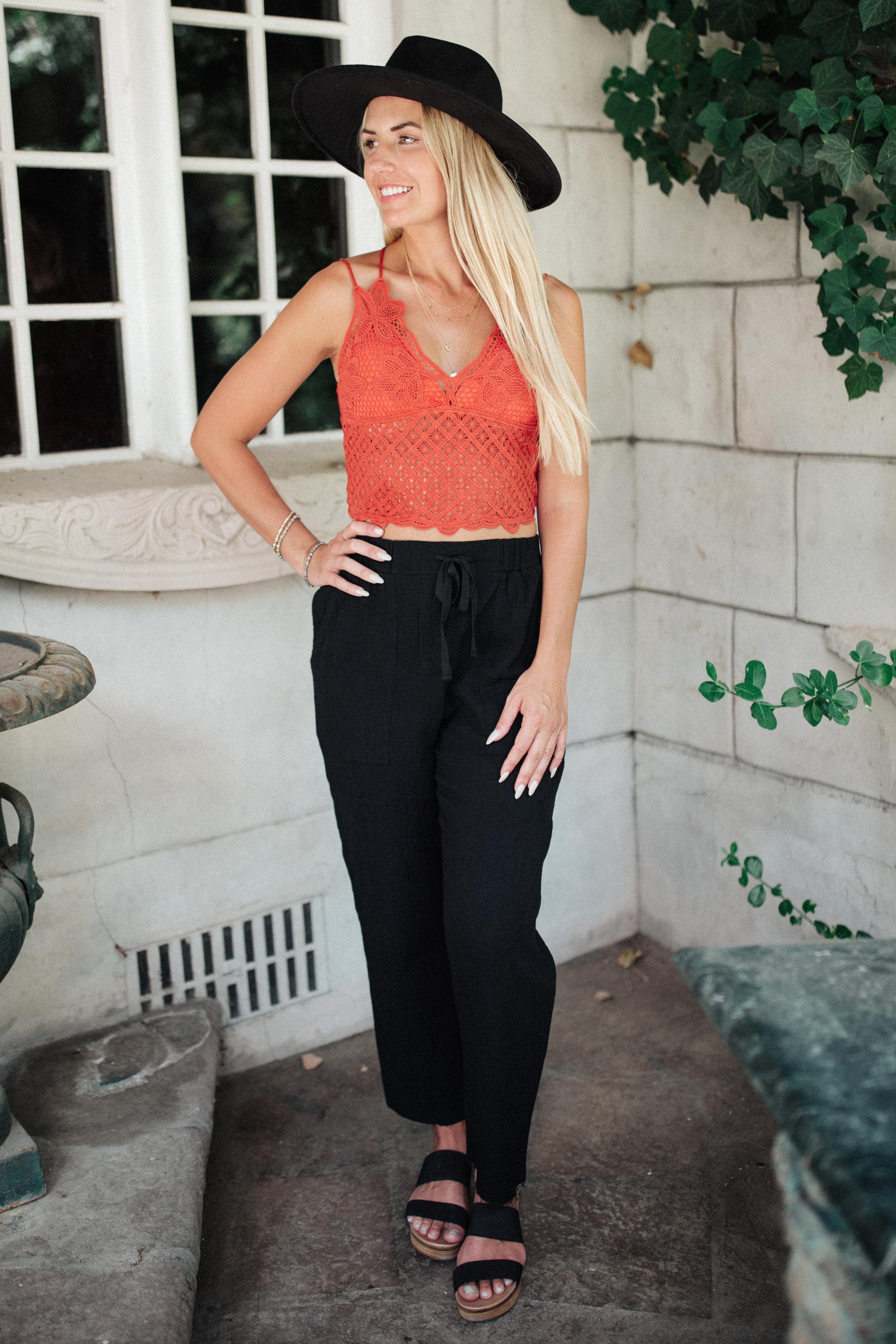 The Wild And Free Crop Top is a beautiful lace tank! We are obsessed with the dainty floral lace and double spaghetti strap. Pair this with shorts or a wide leg trouser for a flirty and feminine outfit.